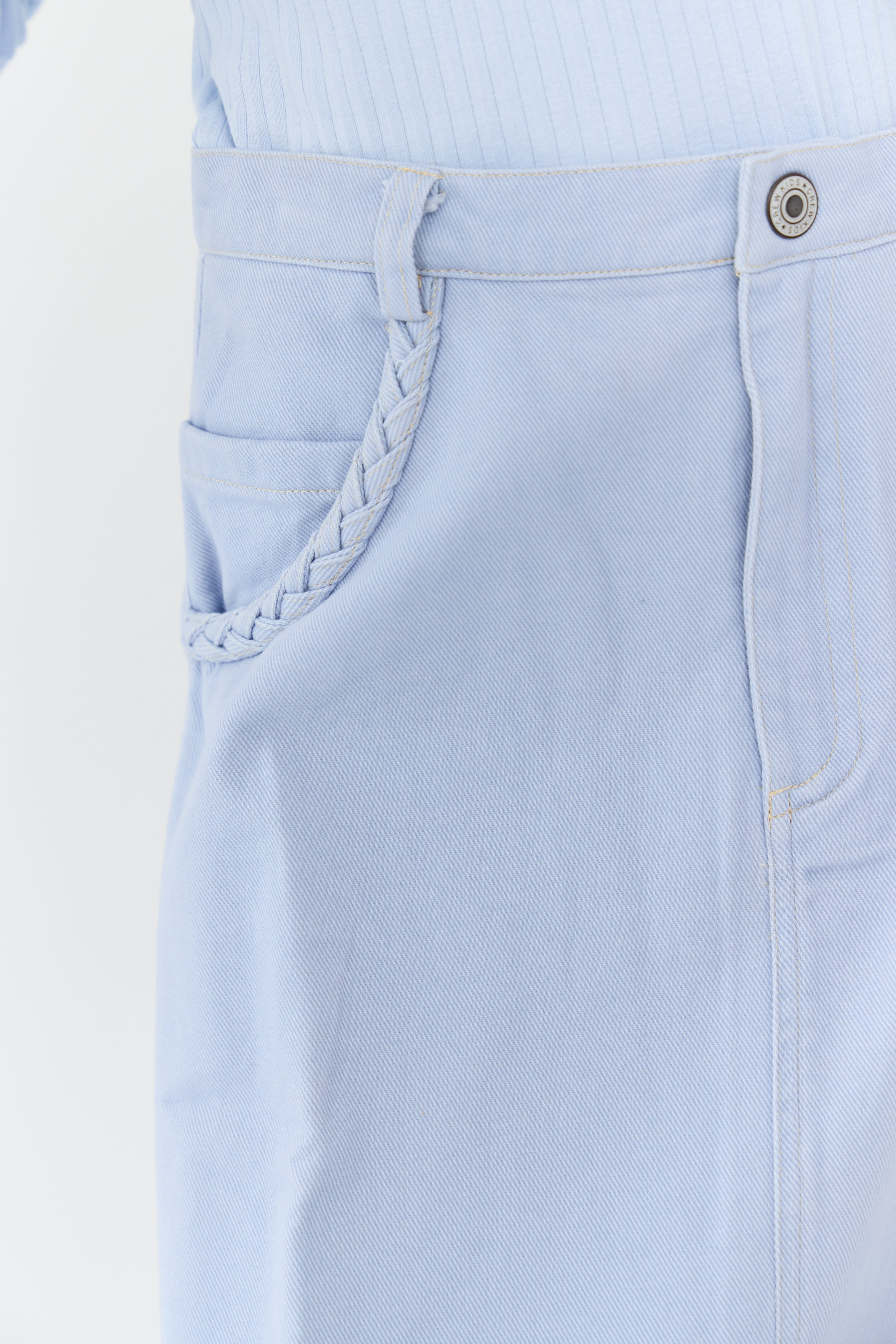 A-line skirt with braided pocket detail and zipper closure. Comes in blue, butter, tan, and vanilla.