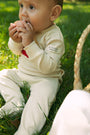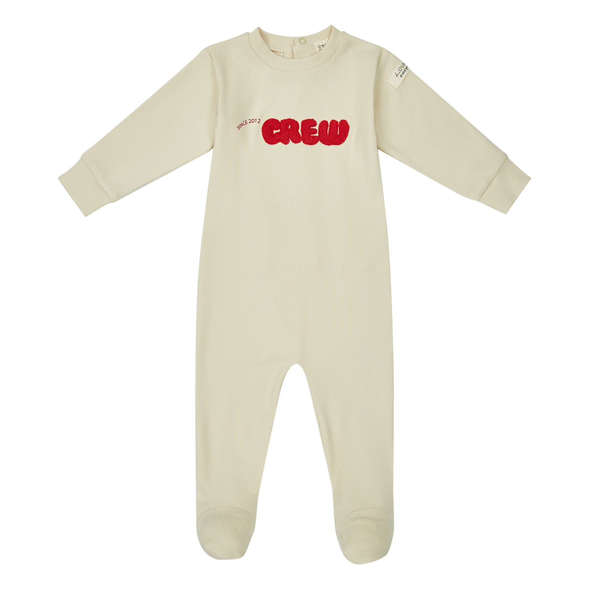 Long sleeve baby onesie with cuff sleeve, front and side patch detail, and snap closure. Comes in green, pink, and stone.