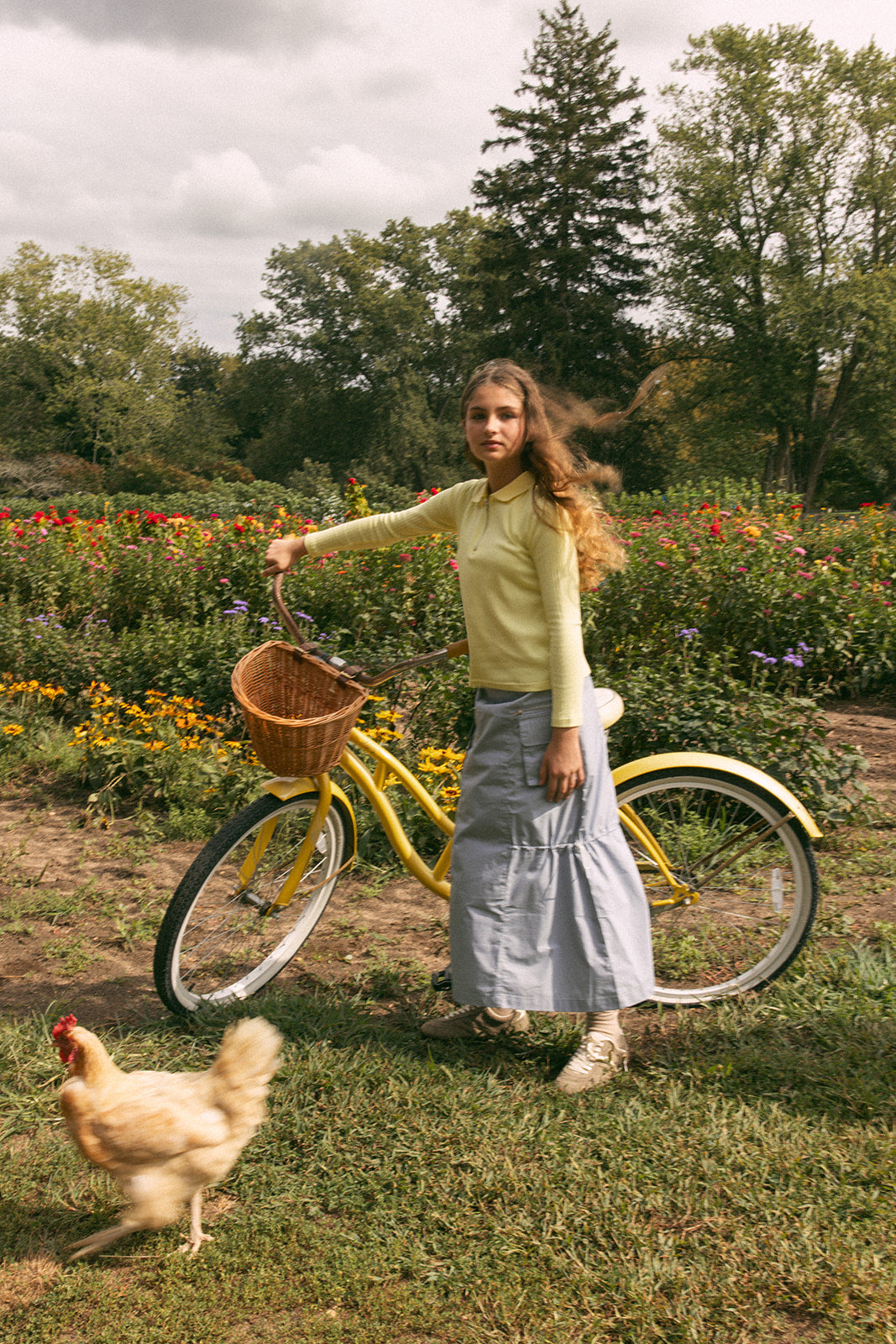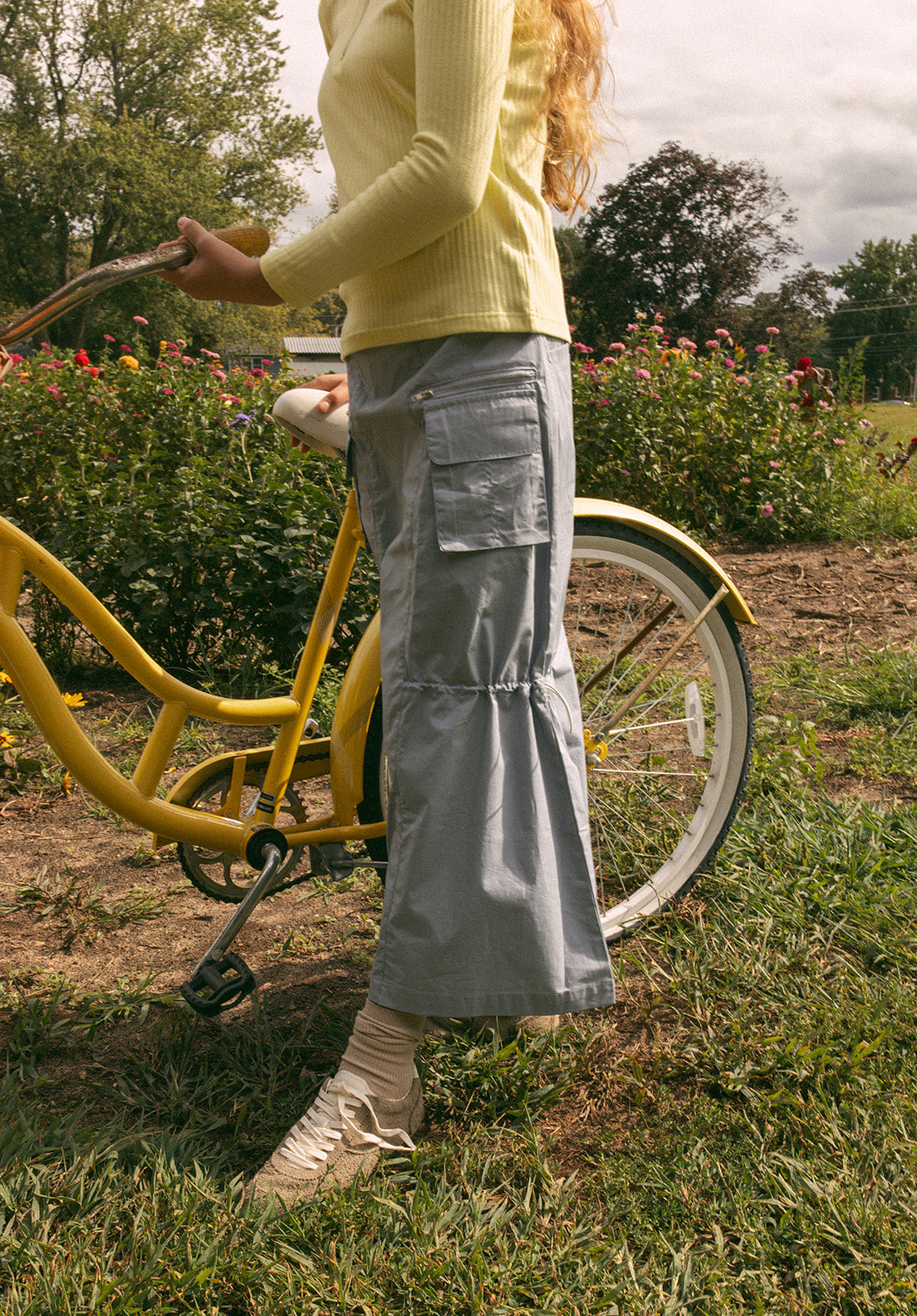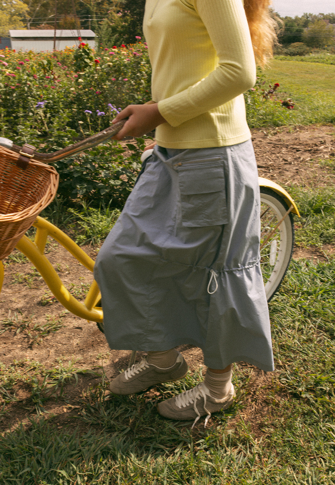 Maxi skirt with front pocket and zipper detail. Comes in black, blue, tan, and vintage green.