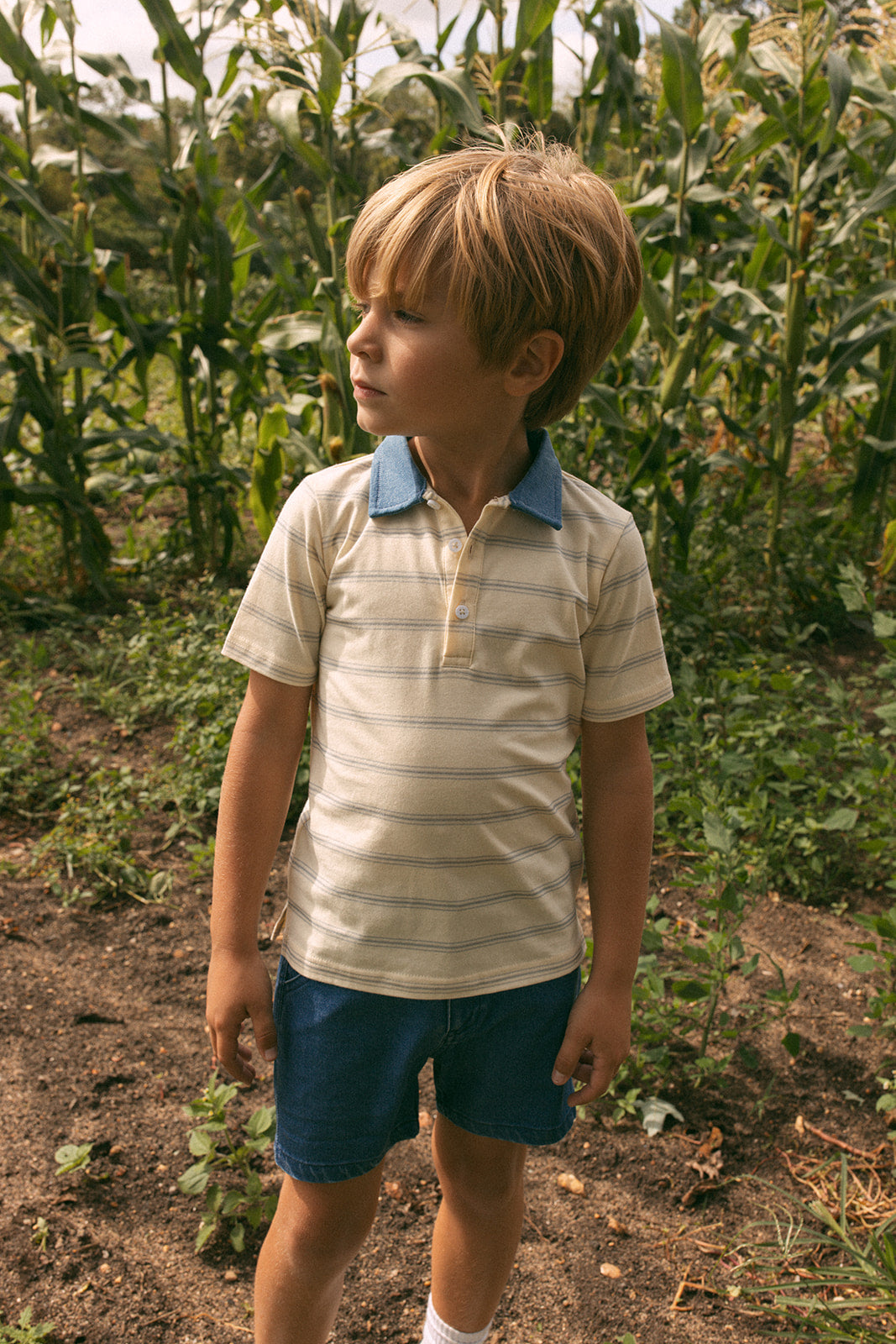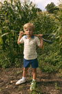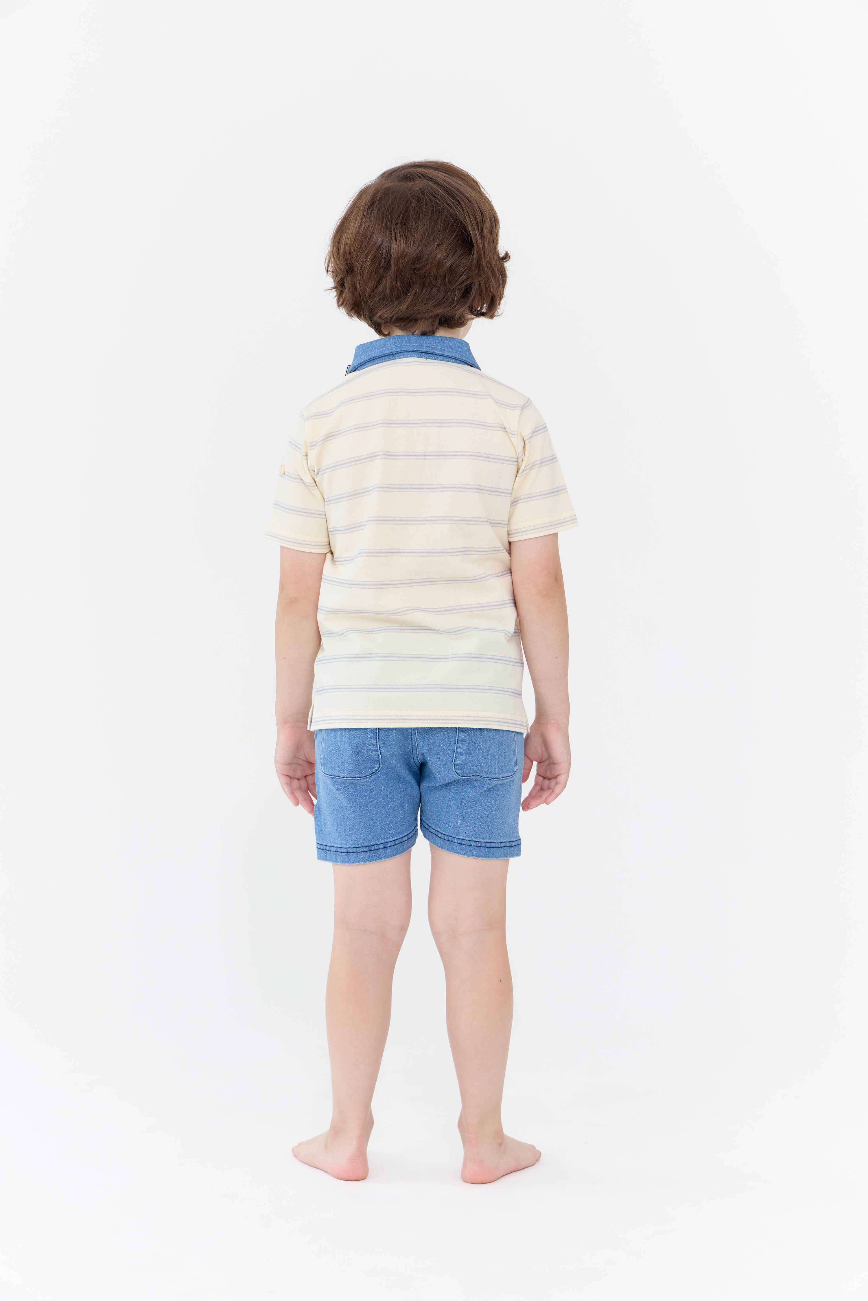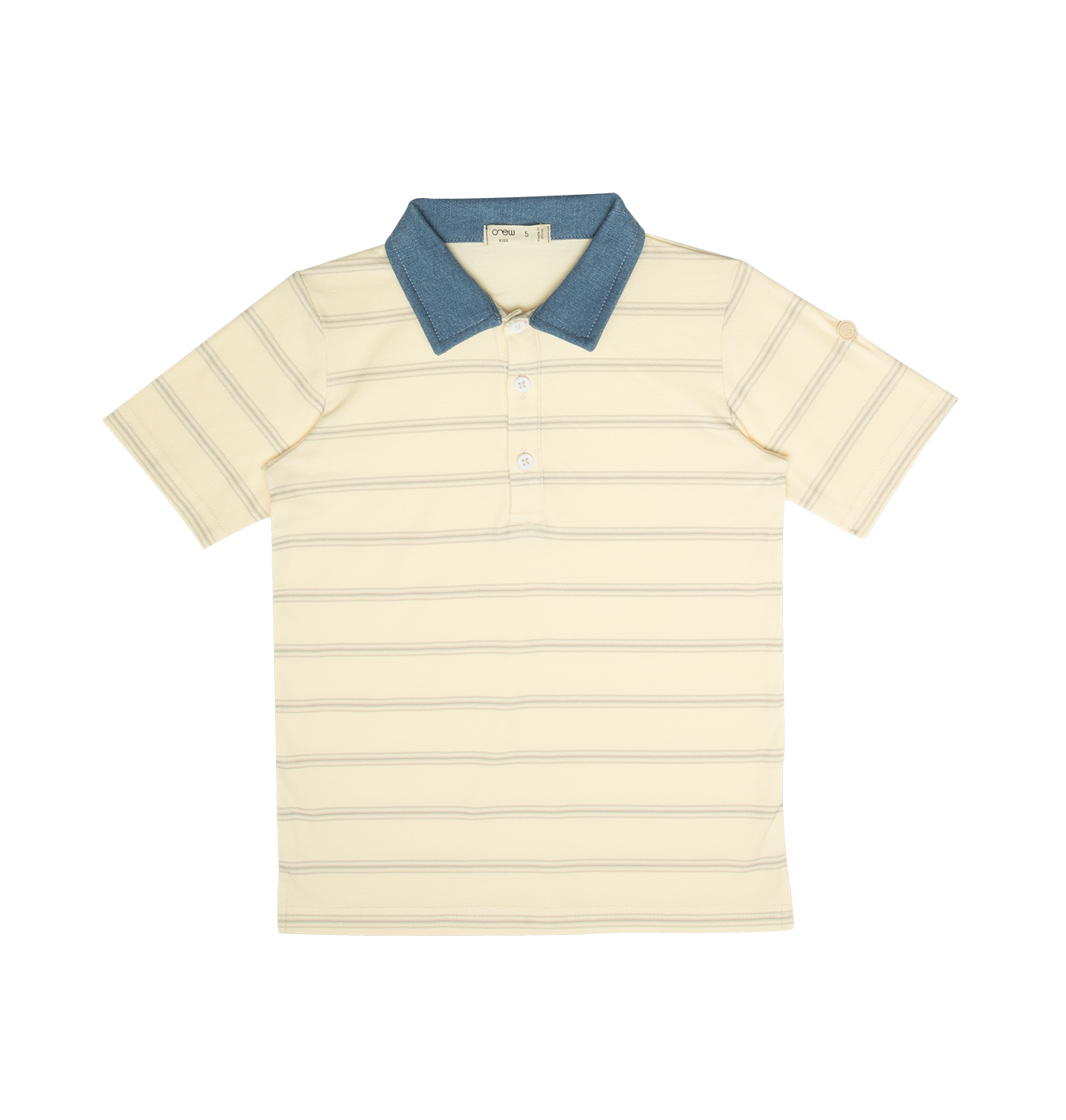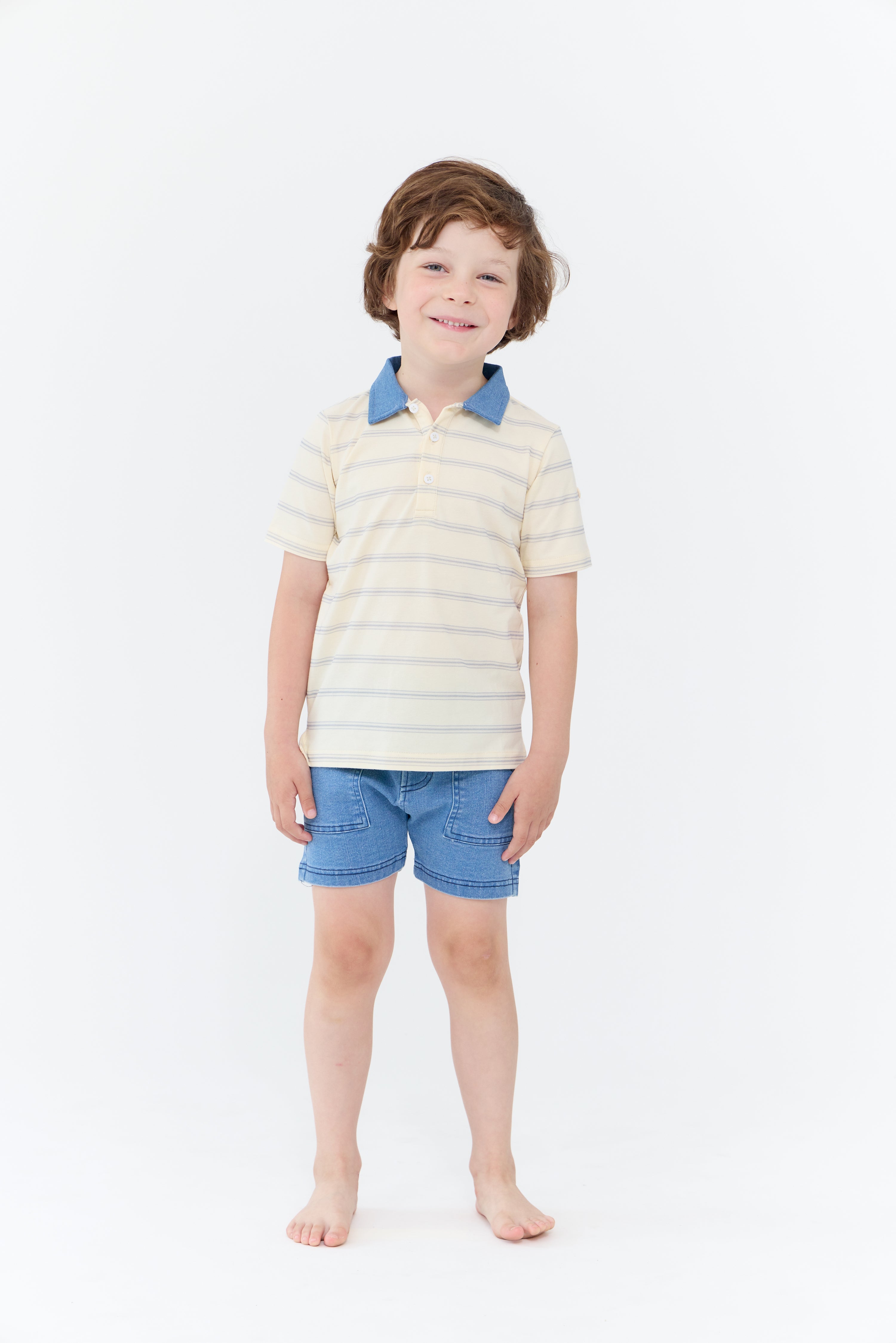Short sleeve shirt with contrast color collar, print, and button detail. Comes in butter, green, and white.