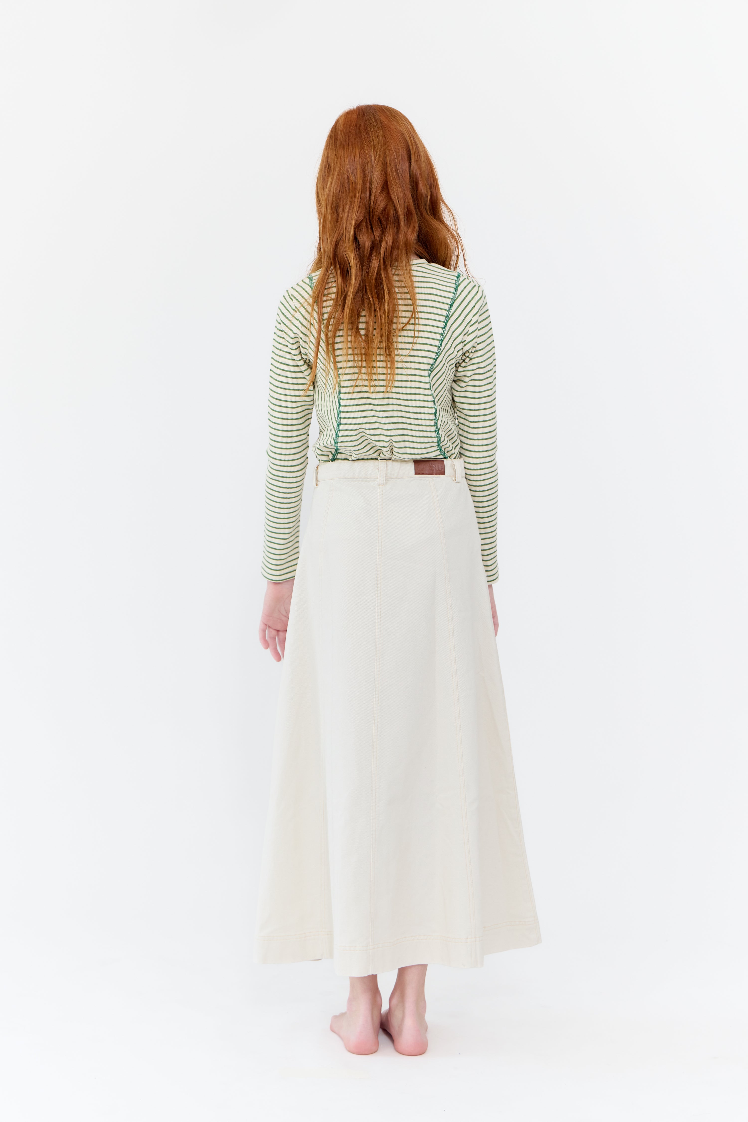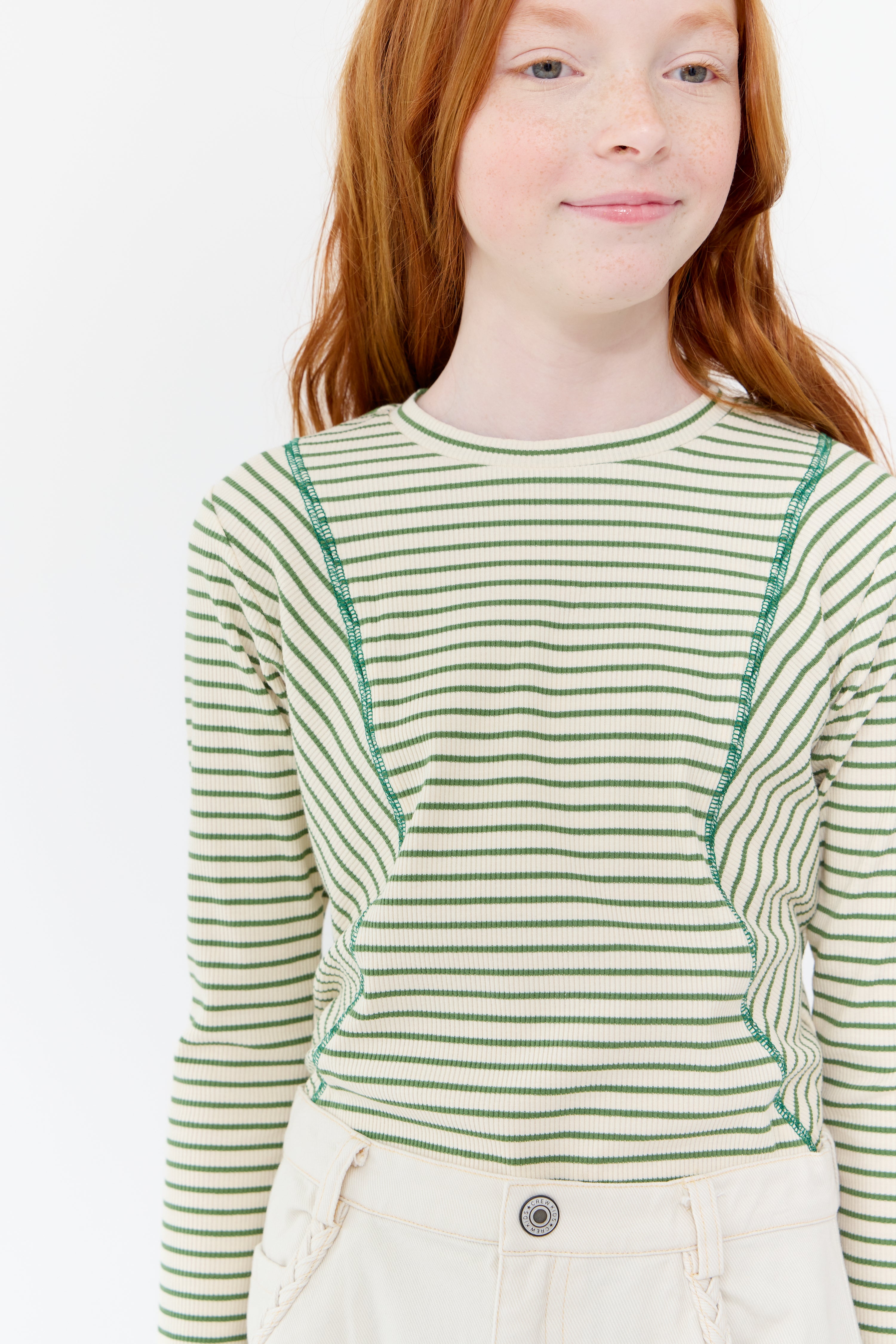 Long sleeve ribbed t-shirt with graphic print and stitching detail. Comes in blue, green, and red.