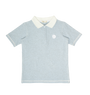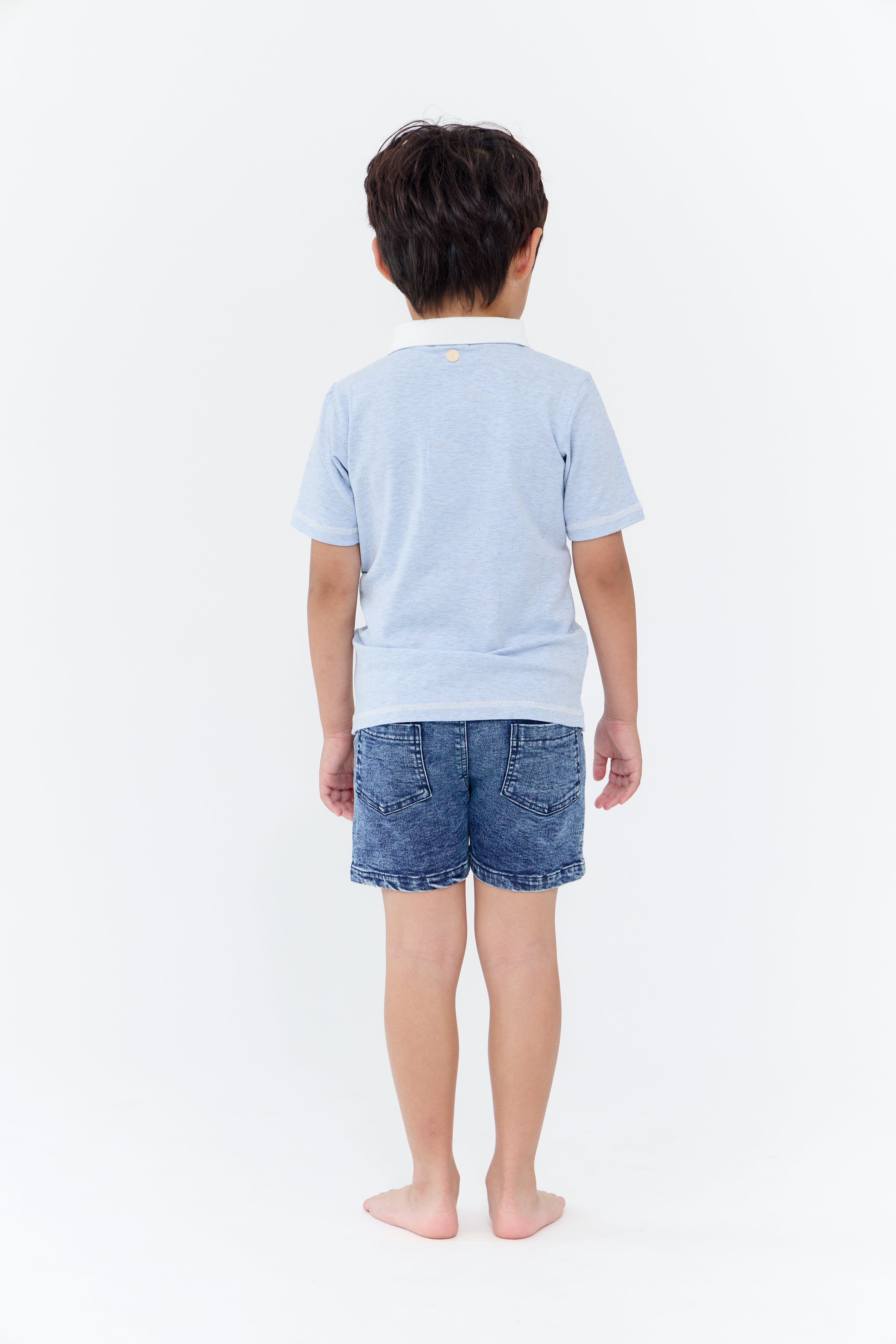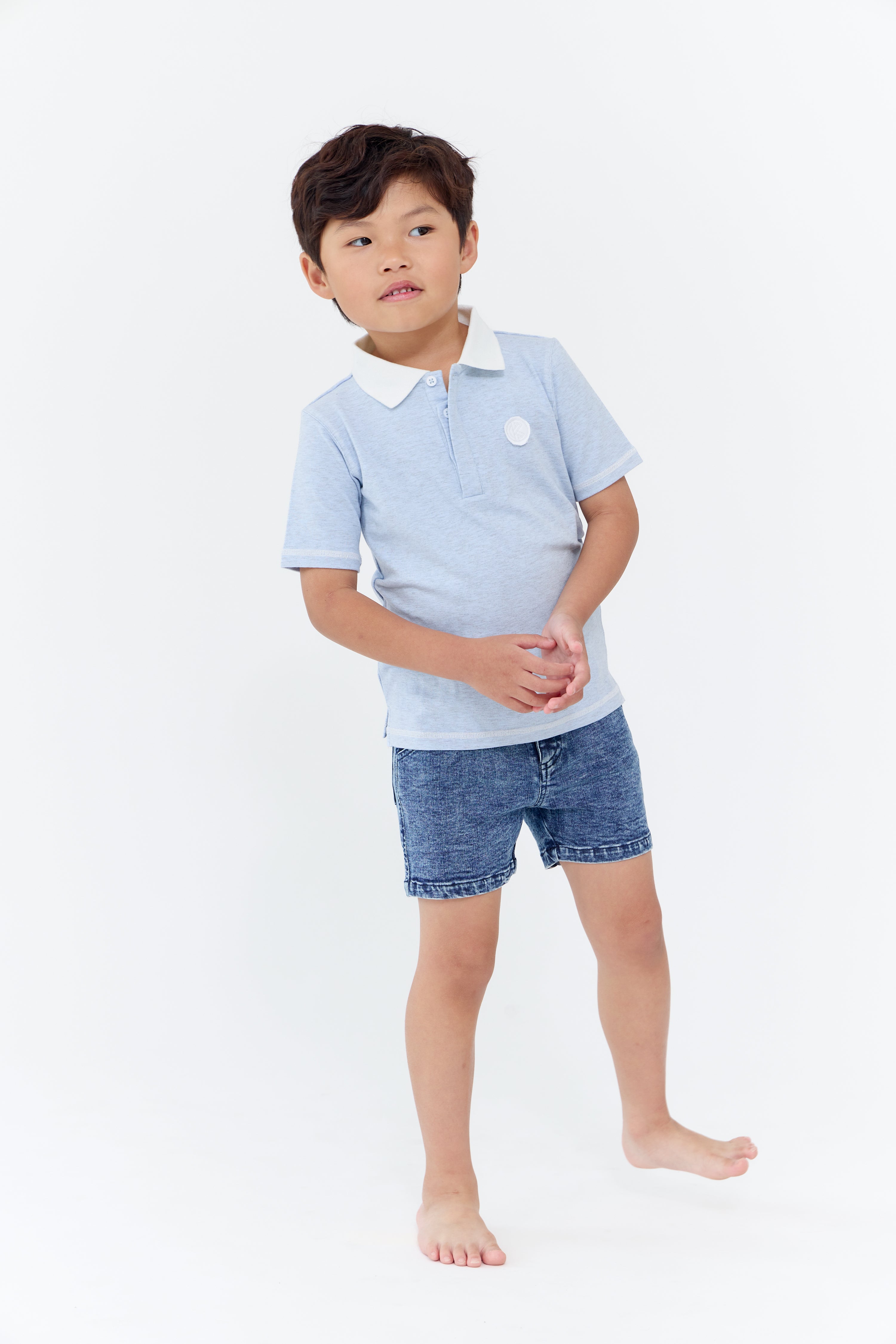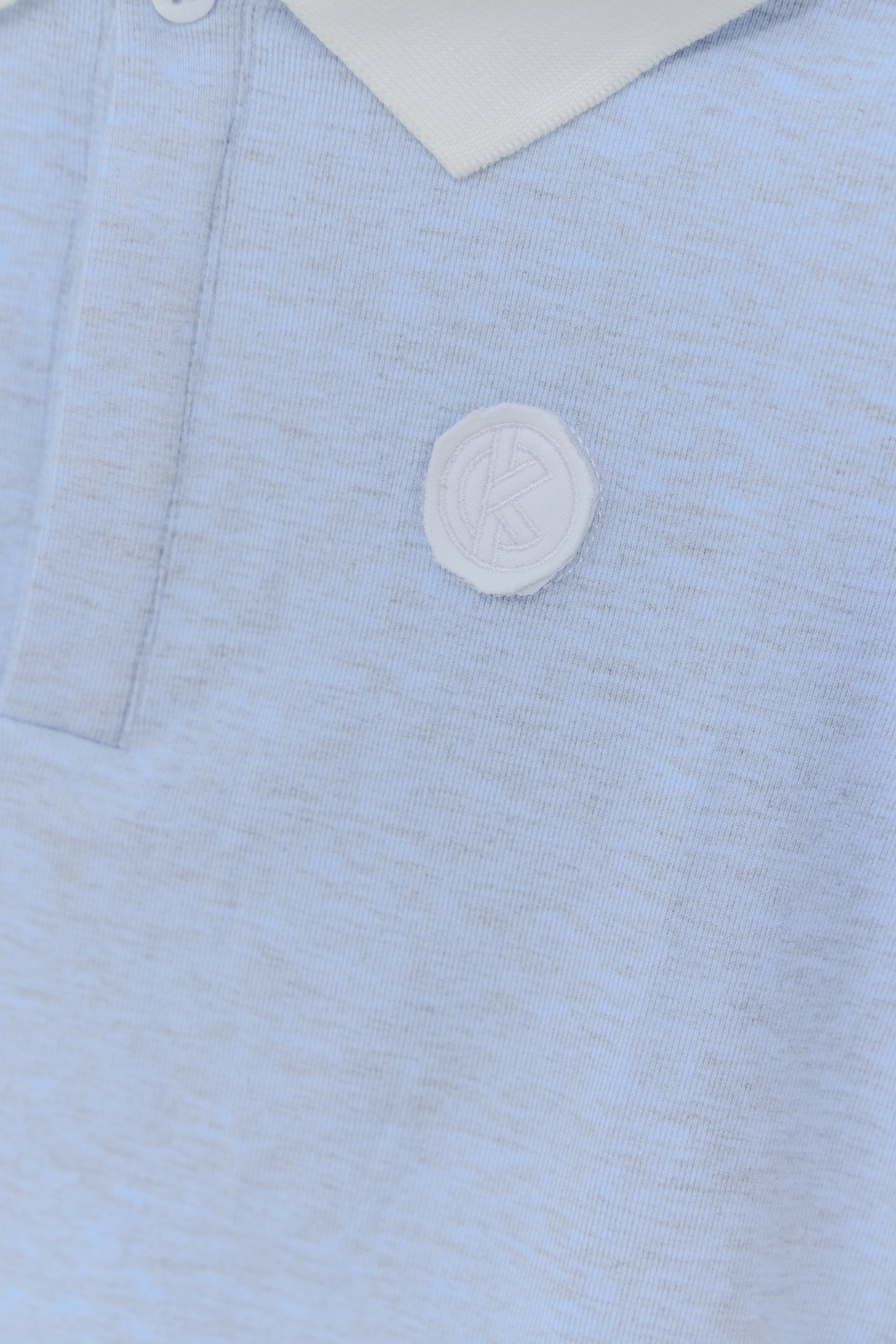 Short sleeve shirt with contrast color collar and logo detail. Comes in blue, white, and yellow.