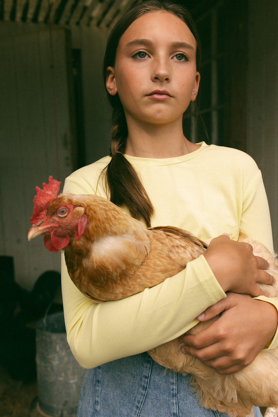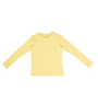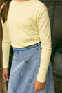 Long sleeve crewneck t-shirt with patch detail. Comes in blue, green, natural, pink, and yellow.