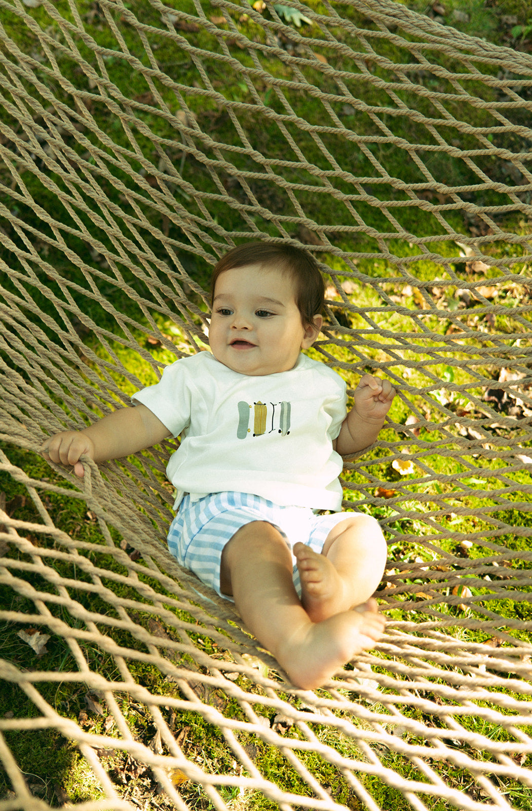 Short sleeve crewneck t-shirt with graphic detail and matching stripe shorts. Comes in blue.