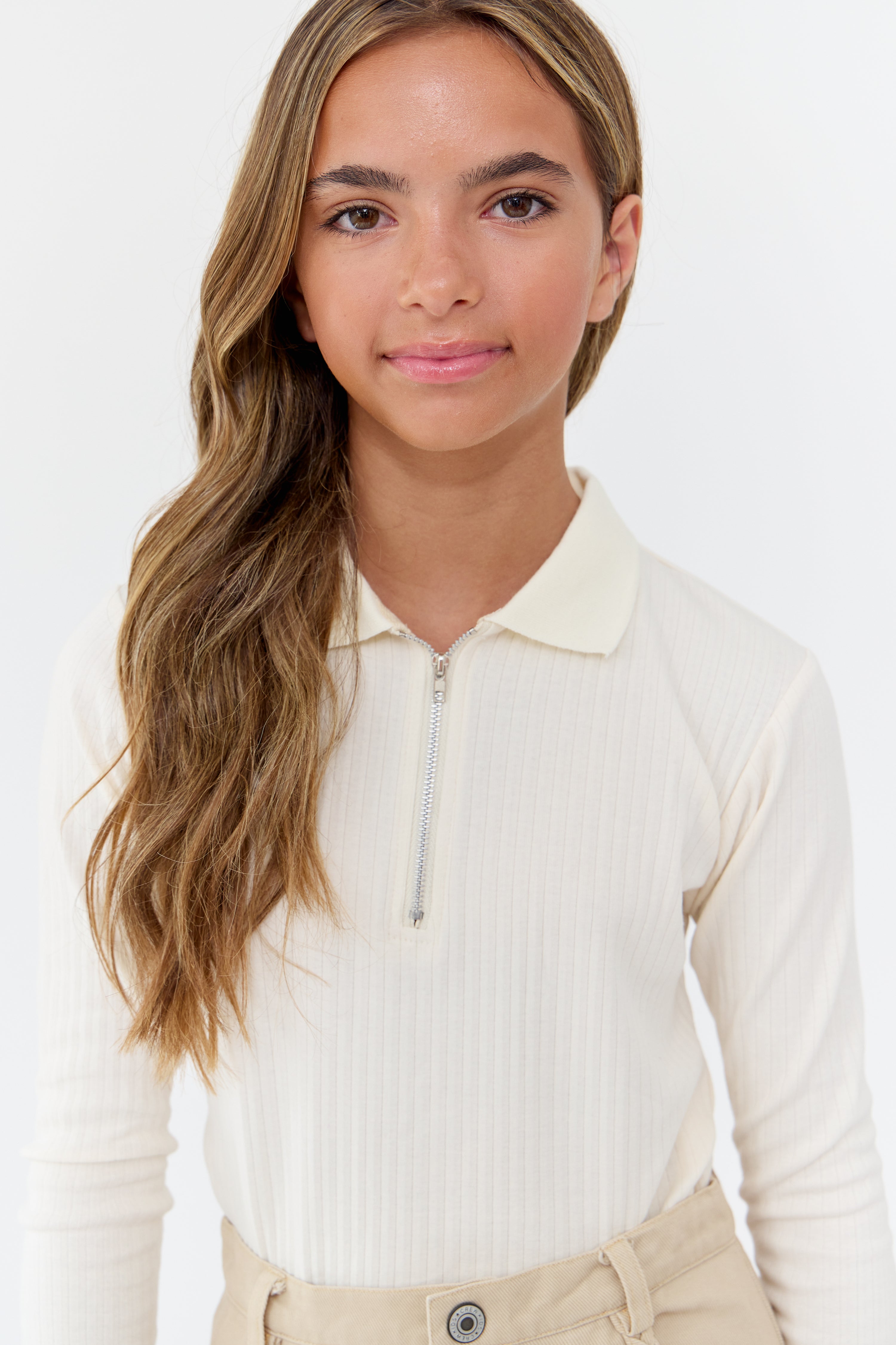 Long sleeve ribbed collared shirt with zipper detail. Comes in blue, grey, tan, vanilla, and yellow.