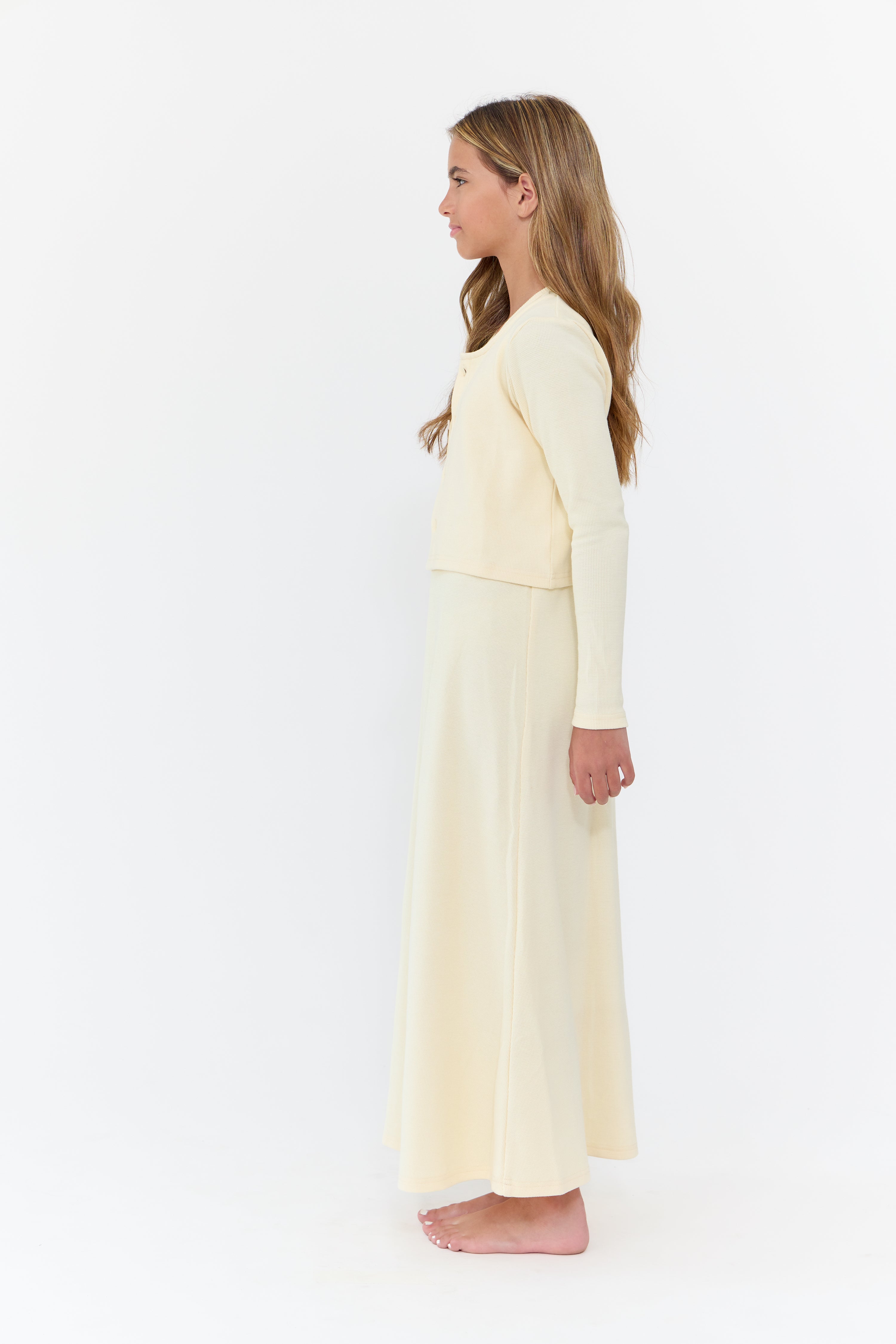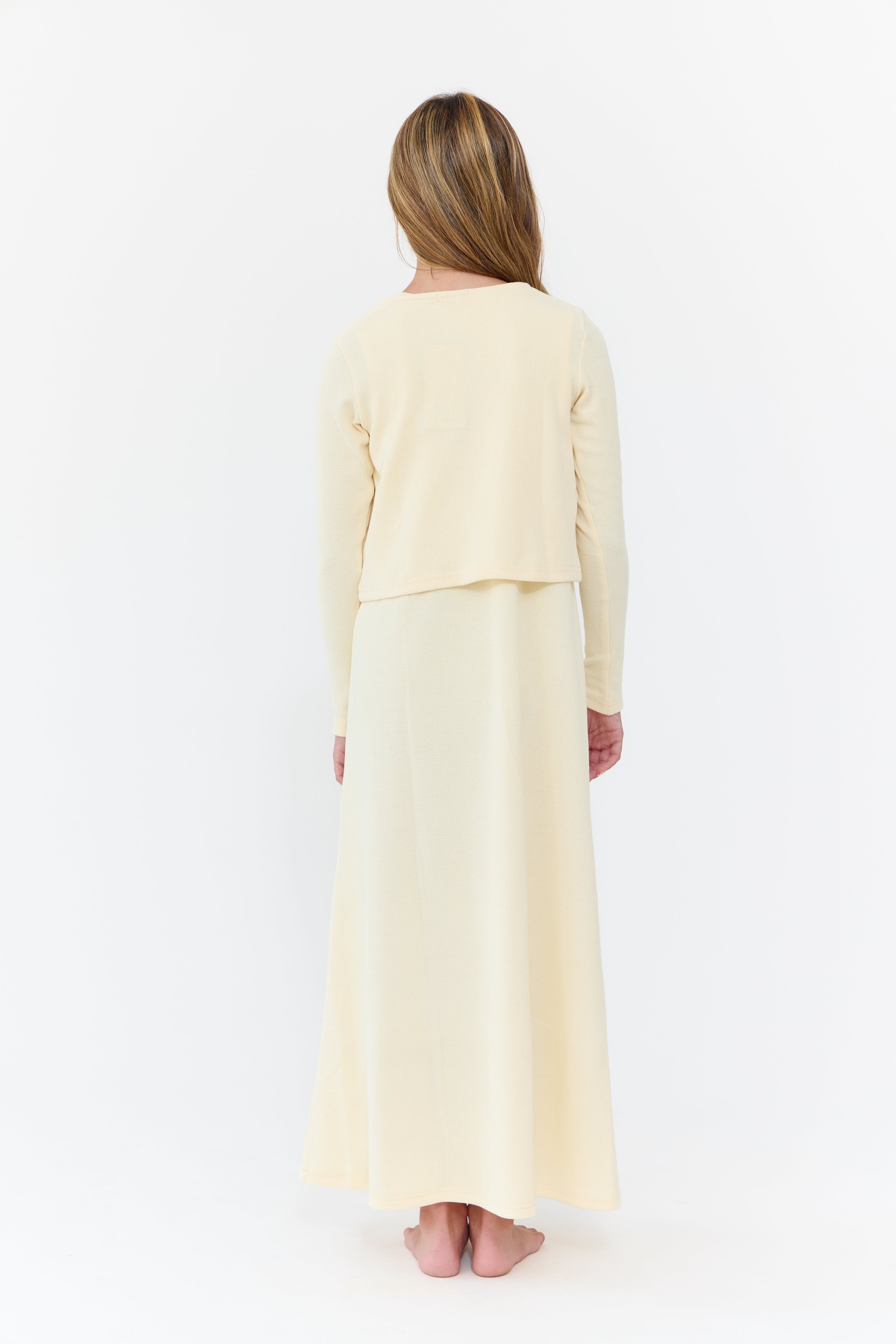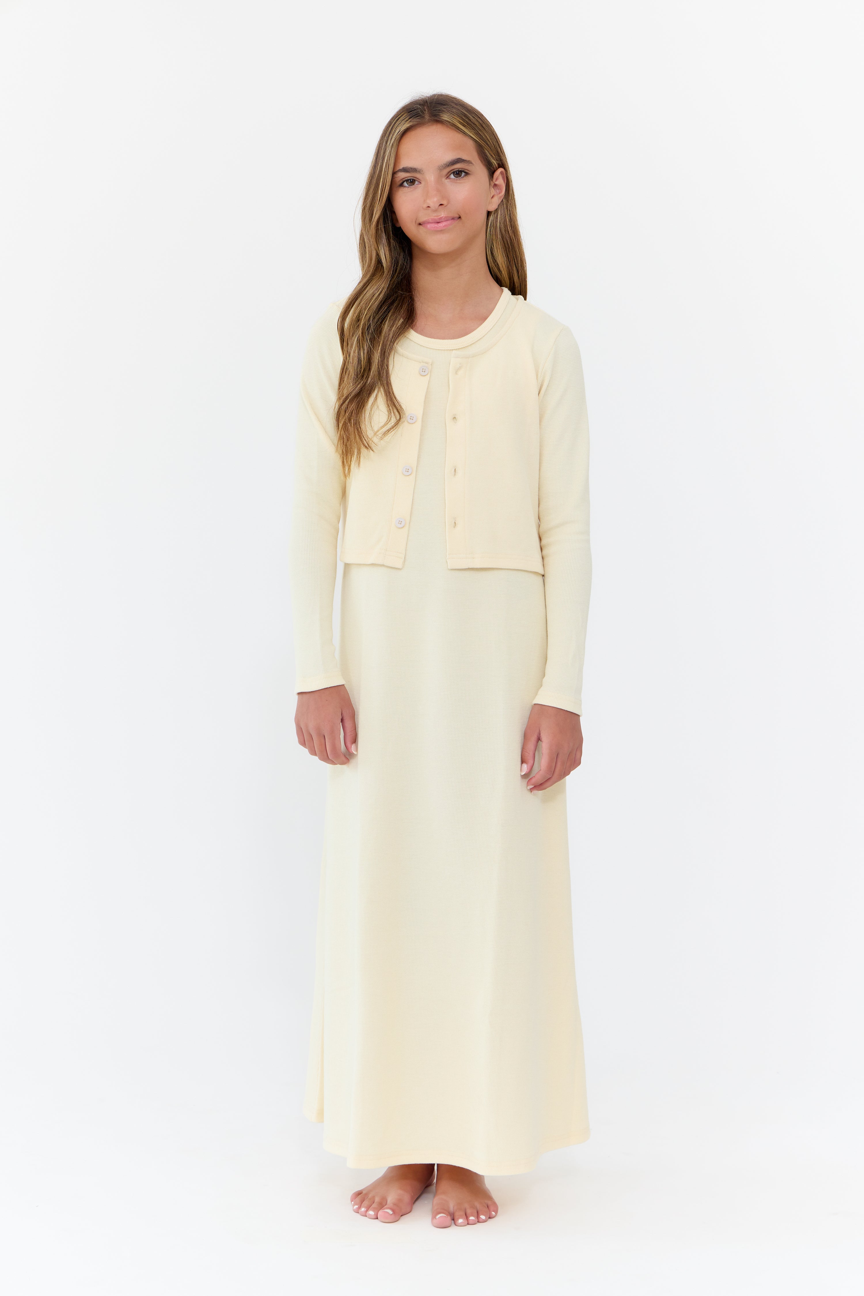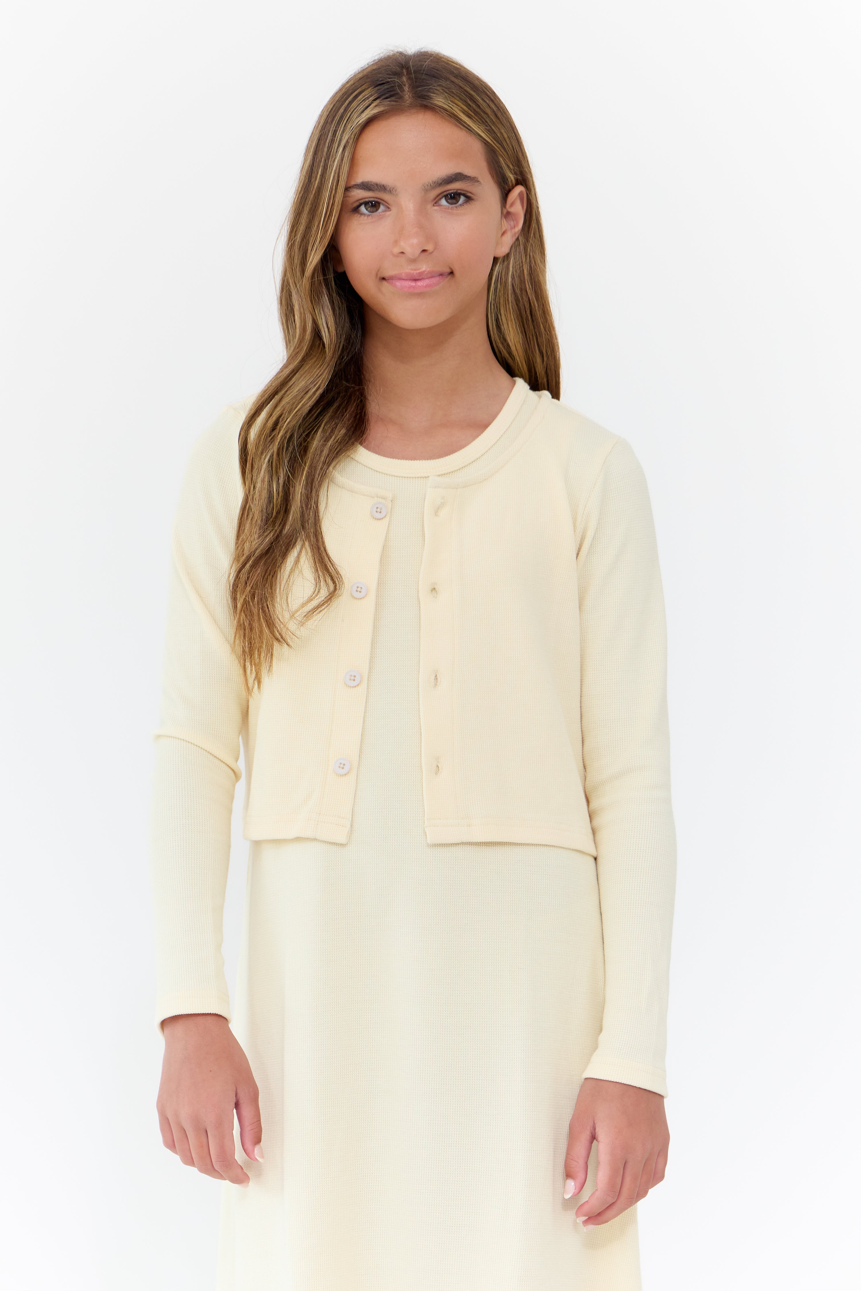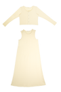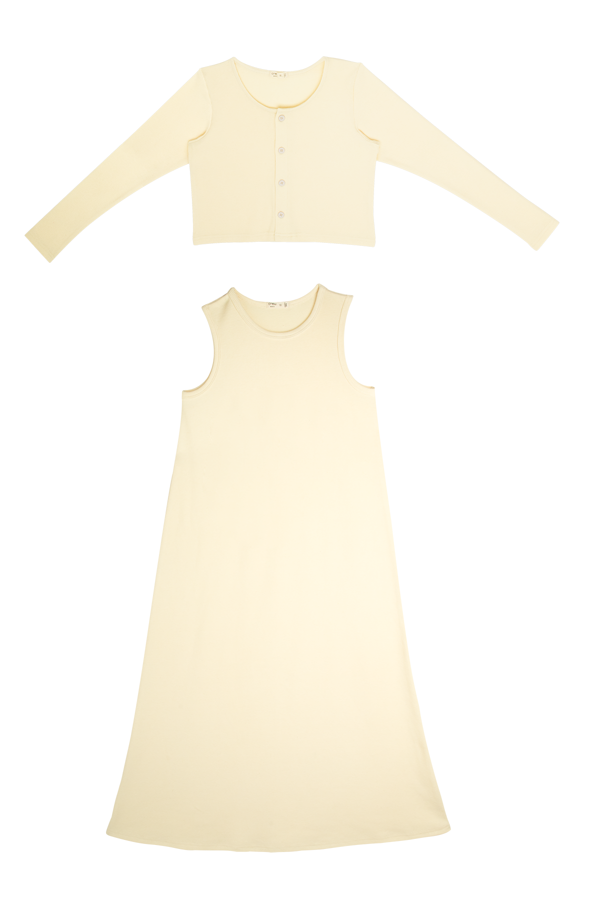 Long sleeve cardigan with button detail, and matching sleeveless dress. Comes in black and natural.