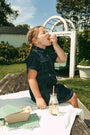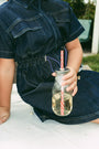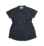 Short sleeve dress with collar, front pockets, and drawstring waist. No pockets. Comes in blue and pink.