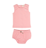 Sleeveless crewneck top with front patch detail and drawstring matching bottoms. Comes in blue and pink.