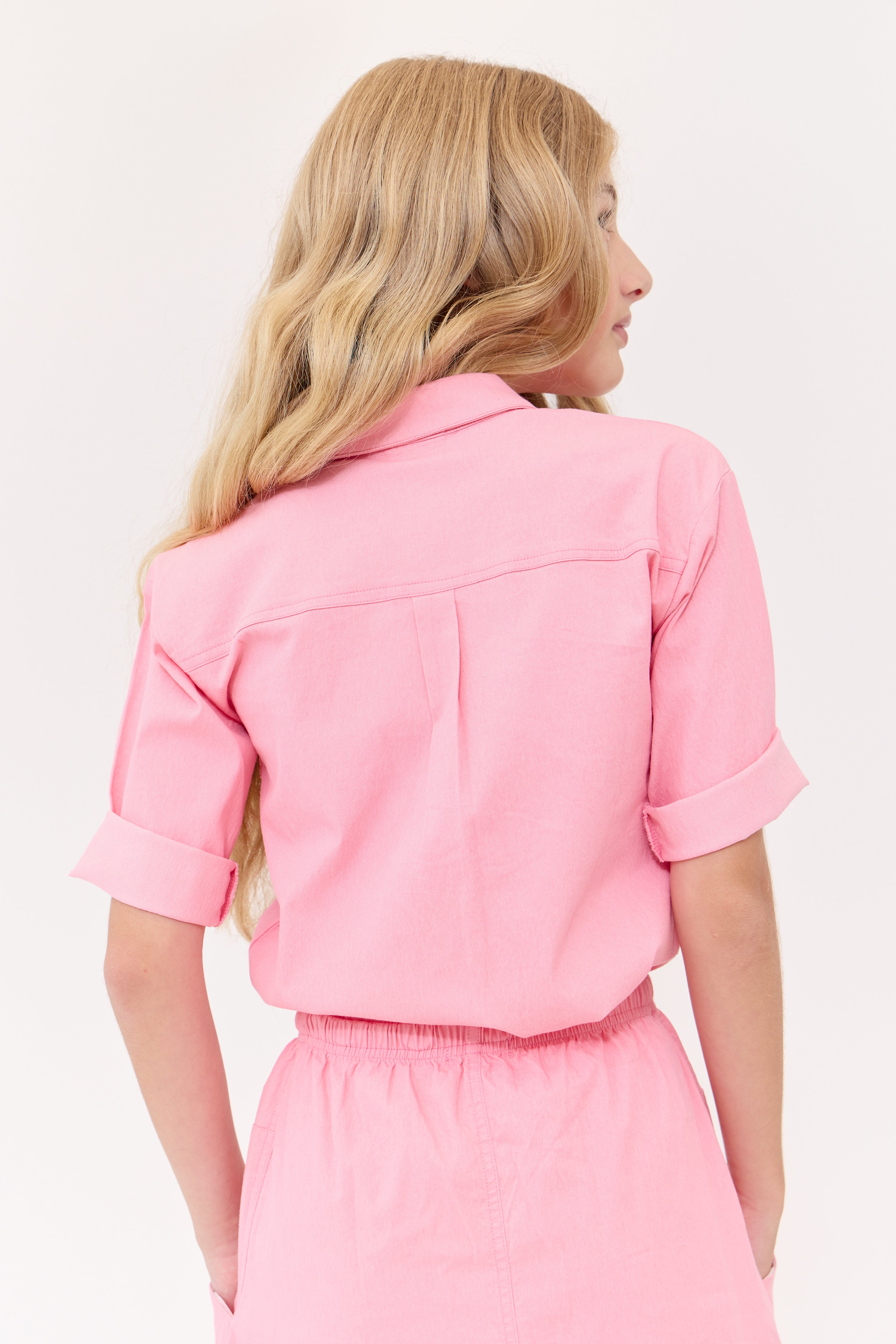 Boxy elbow sleeve button up with collar and front pocket detail. Comes in pink and blue.