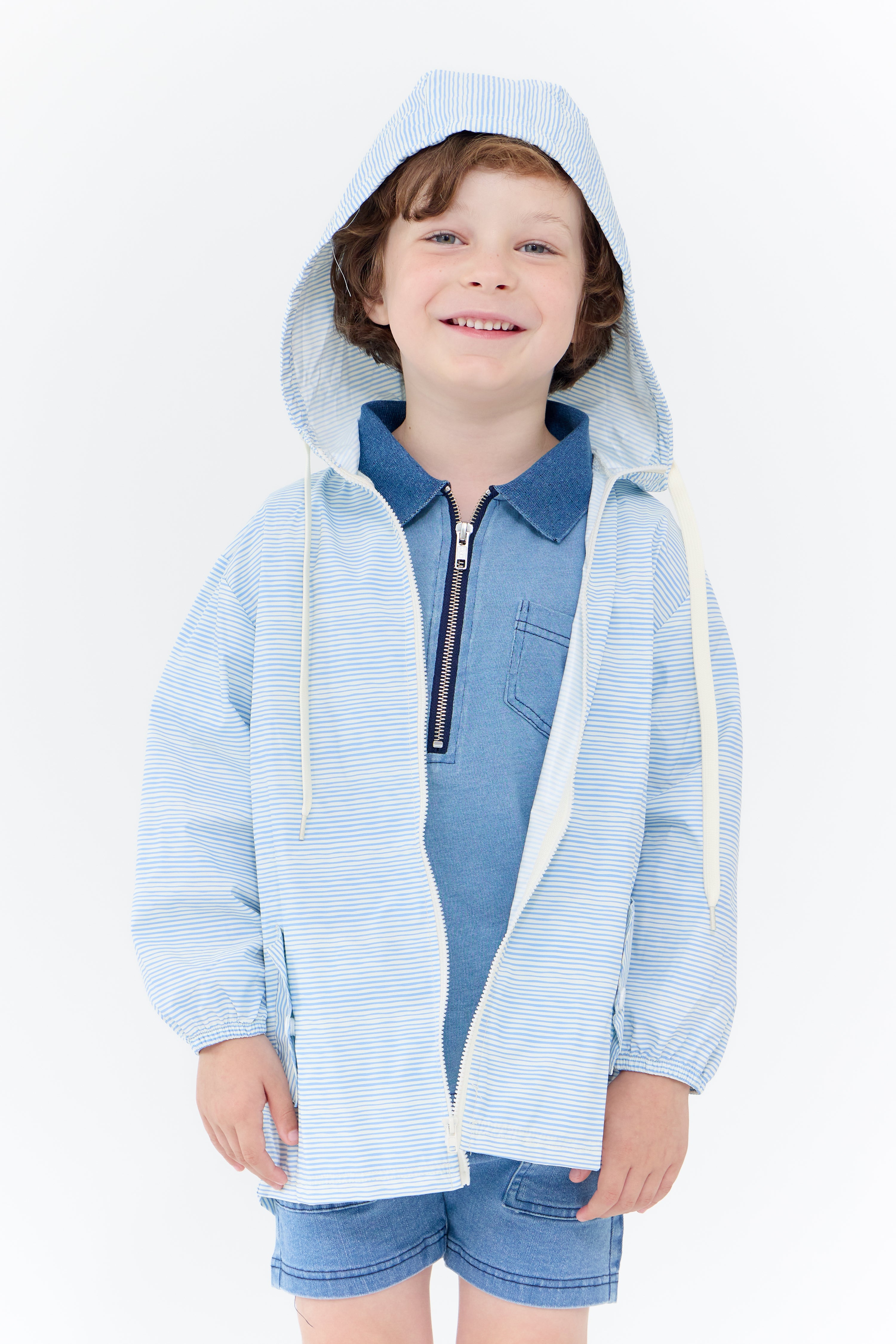 Full zip jacket with drawstring hood, front pocket, and graphic print detail. Comes in red and blue.