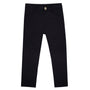 Slim pant with button and front pocket detail. Comes in black and navy.