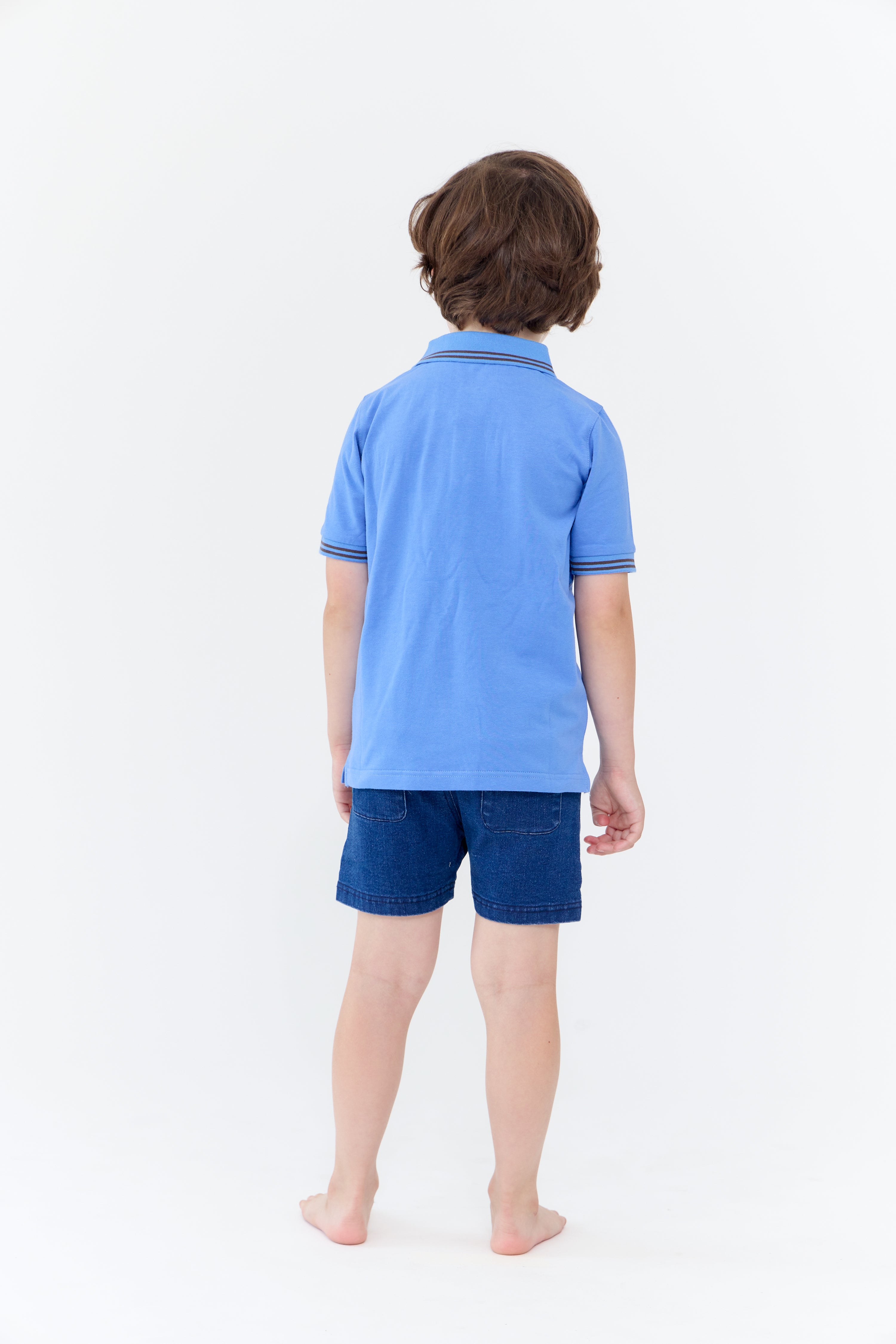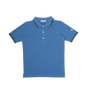 Short sleeve collared shirt with button, logo, and stripe detail. Comes in blue, celery, and teal.